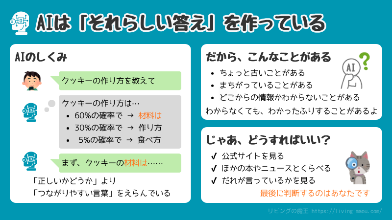 たくさんの文章ぶんしょう学習がくしゅうしていて、質問しつもんたいして「ただしいかどうか」よりも「いちばんそれらしいこたえ」を予想よそうして文章ぶんしょうつくっています。