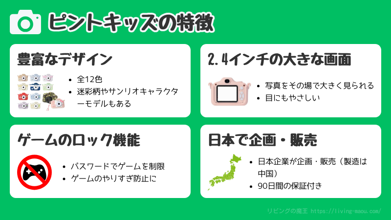 製造は中国ですが、日本企業が企画・販売を担当。本物のデジカメと同じ工場ラインで作られているため、丈夫で故障しにくいのが特長です。