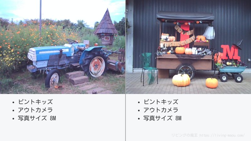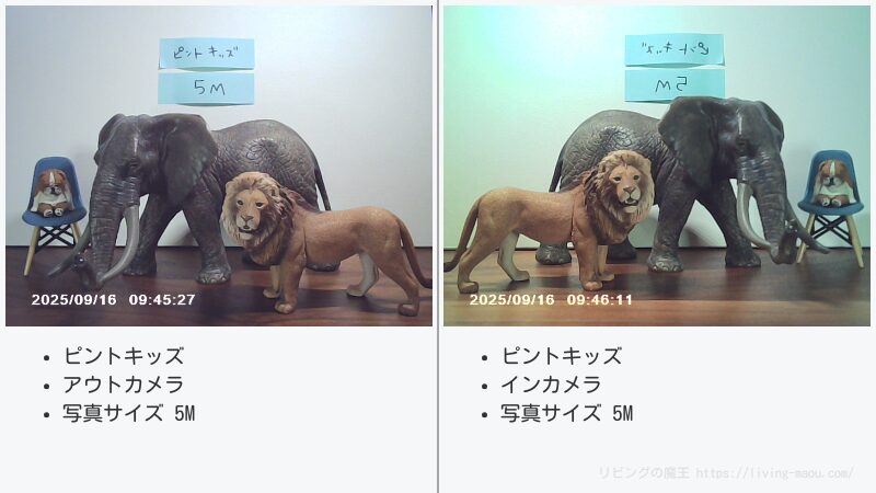 写真は、自動補正のあるピントキッズの方が明るく撮影可能。ミニピクはコントラストが高めで、少しシャープな印象でした。