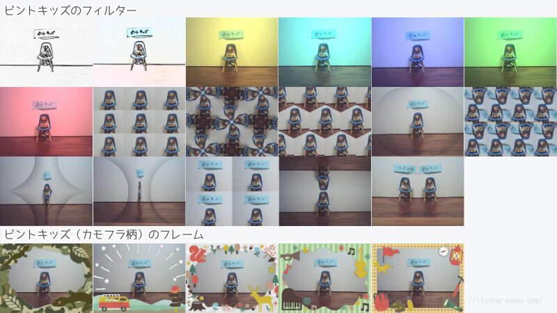 公式サイトでは「フィルター16種類・フレーム12種類」とありましたが、実際にはフィルター17種類・フレーム5種類でした。カモフラージュ柄は内容が異なるのかもしれません。