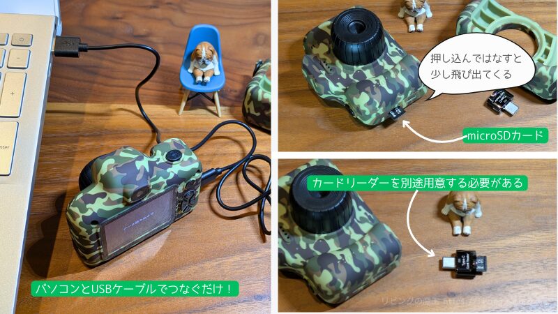 パソコンへの転送は、付属のUSBケーブルでカメラと接続するだけ。充電も同じケーブルでできるので便利です。